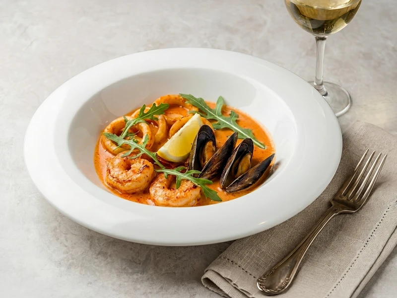 В одной тарелке встречается целая палитра морских текстур. Всё это великолепие объединяет авторский азиатский соус. В его основе — классический соевый соус, нотки кунжутного масла, свежий имбирь и капля устричного соуса для глубины вкуса. Легкая пряность чеснока и едва уловимая острота перца чили создают тот самый эффект «умами», который заставляет возвращаться к этому блюду снова и снова. Морской коктейль: Возможность насладиться сразу несколькими видами премиальных морепродуктов в одном заказе. Аутентичный соус: Заправка не перебивает вкус моря, а лишь подчеркивает его, добавляя восточной пикантности. Польза и легкость: Блюдо богато легкоусвояемым белком и минералами, что делает его отличным выбором для легкого, но насыщенного ужина.