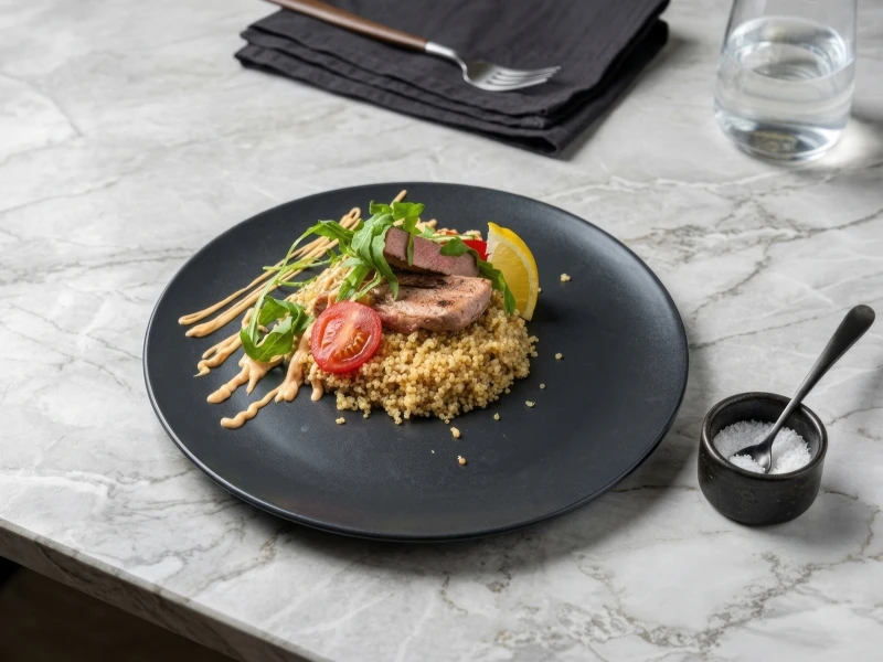 Это блюдо — эталон современной гастрономии, сочетающее в себе изысканность морских деликатесов и неоспоримую пользу суперфудов. Легкое, эстетичное и невероятно питательное, оно создано для тех, кто выбирает осознанное питание, не жертвуя богатством вкуса. Центром композиции является филе тунца класса Premium. Мы готовим его в стиле «мид-раре», чтобы сохранить уникальную маслянистую текстуру и благородный розовый цвет внутри, создавая лишь тонкую обжаренную корочку снаружи. В качестве гарнира выступает киноа — «золотое зерно» инков. Её легкий ореховый привкус и приятная упругая текстура идеально дополняют нежность рыбы. Блюдо объединяется воедино благодаря легкому цитрусовому или имбирному соусу, который придает финальный освежающий штрих.
