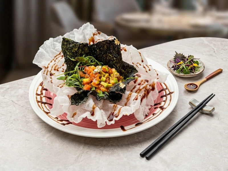 Это блюдо — воплощение изысканности и свежести, где нежность морской рыбы встречается с экзотической сладостью тропиков. Тартар представляет собой безупречный гастрономический дуэт, в котором каждый ингредиент подчеркивает достоинства другого. Основа блюда — охлажденное филе атлантического лосося, нарезанное аккуратными кубиками. Его маслянистая текстура идеально сочетается с бархатистым, тающим во рту авокадо. Главный акцент и «душа» этого тартара — авторский соус из спелого сладкого манго. Он добавляет яркую фруктовую кислинку и приятную сладость, которая эффектно раскрывает благородный вкус рыбы.